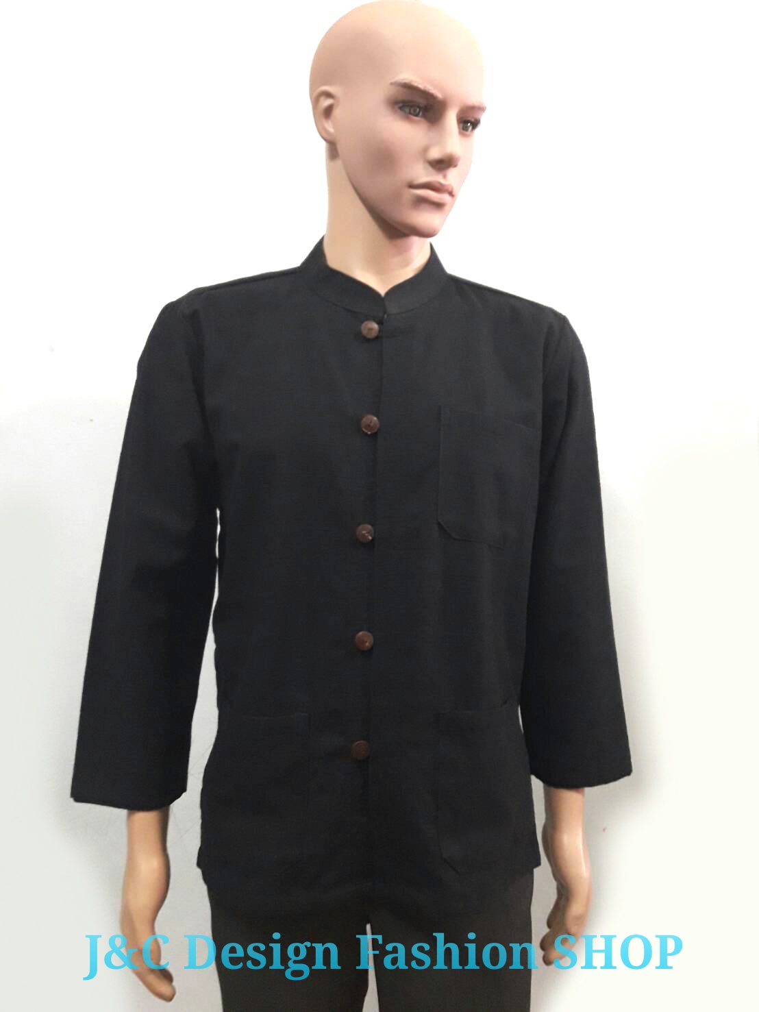 เสื้อผ้าฝ้ายม้อฮ่อมชาย เสื้อผ้าไทยชายสีดำคอจีนแต่งกระดุม เสื้อผ้าไทยชายสีดำ เสื้อผ้าพื้นเมืองผ้าไทยชายสีดำ